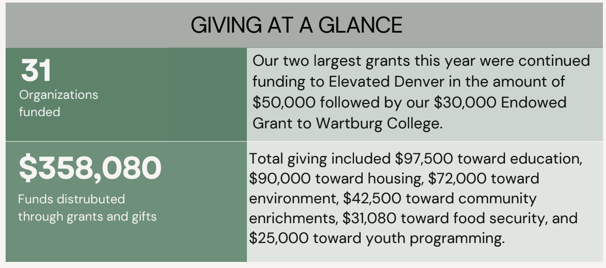 Our giving in 2025 was fairly evenly split between housing, with another large grant to Elevated Denver’s Community Hub project among other housing organizations, and education, with a large endowed grant going to student experience funds at Wartburg College, and again, additional funding split among other local Denver education organizations. We met our goal of expanded environment and conservation giving this year by increasing funding for that pillar from less than 1% to 20% of all grants in 2025. We are well on our way to $1,000,000 given which is a milestone we plan to meet after our first grant deadline of 2026.